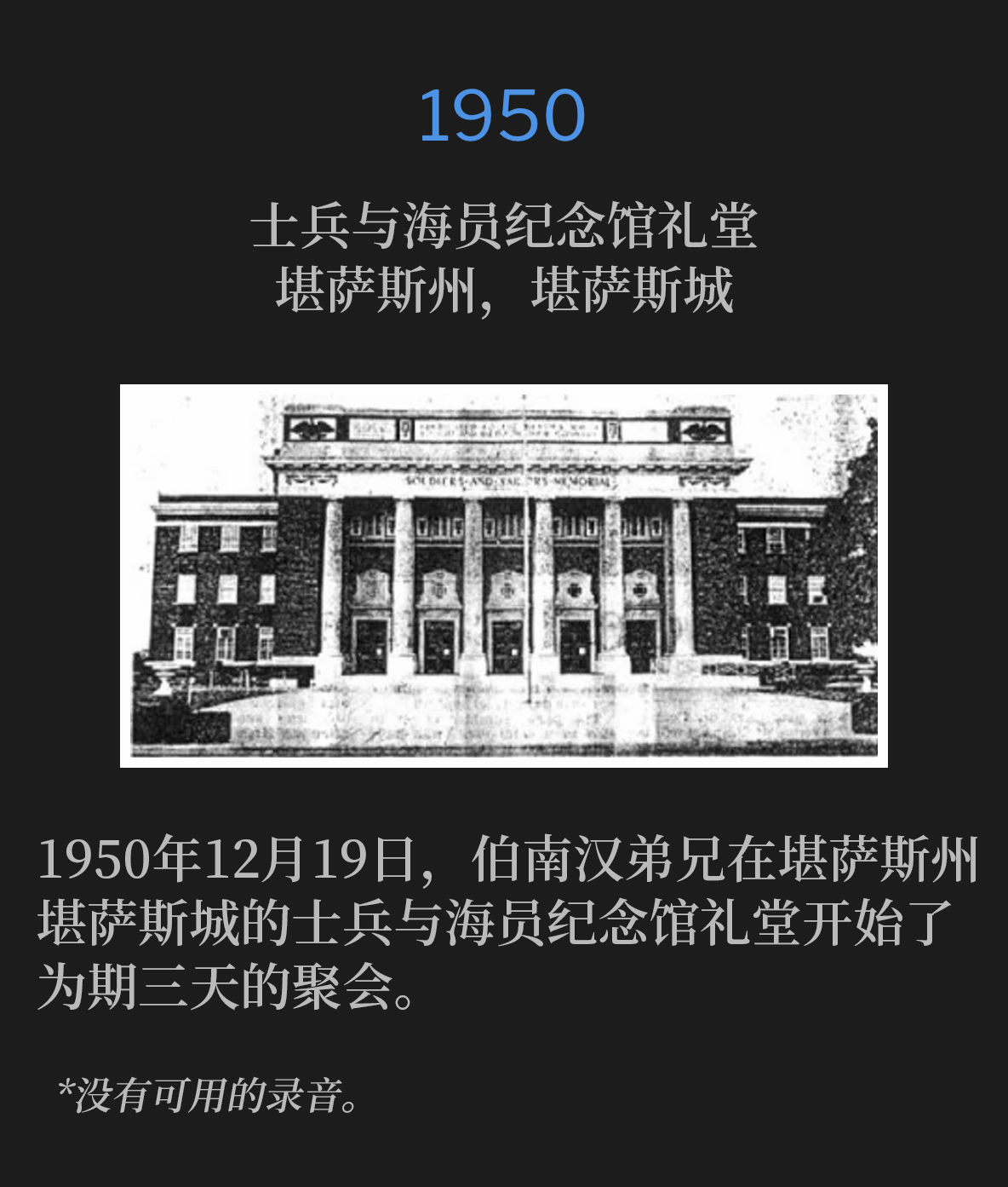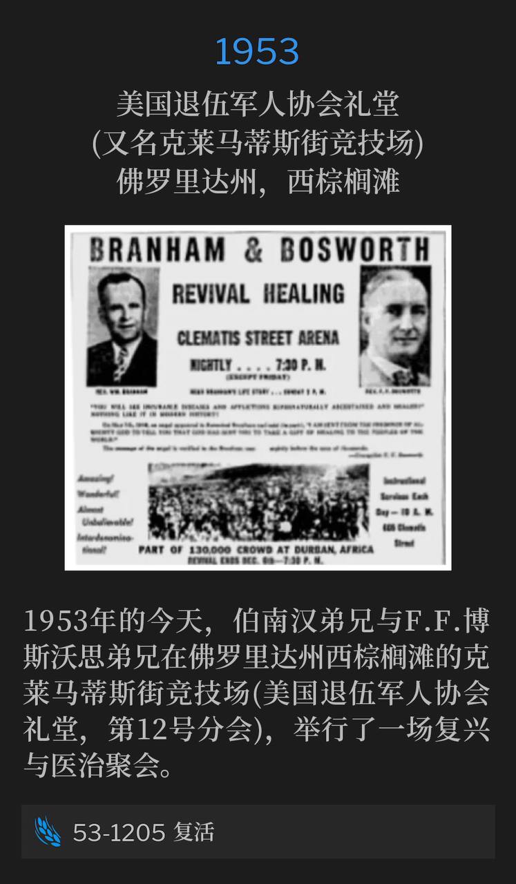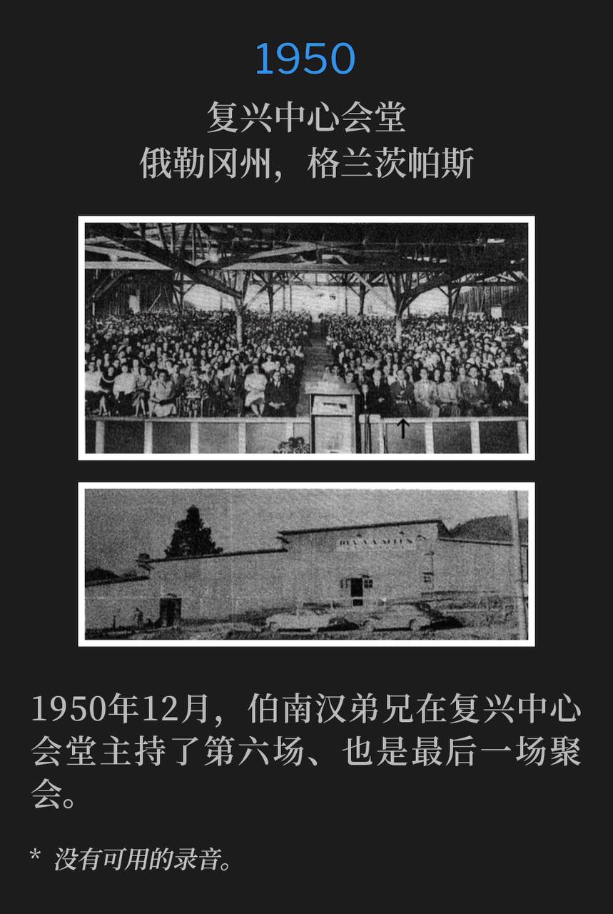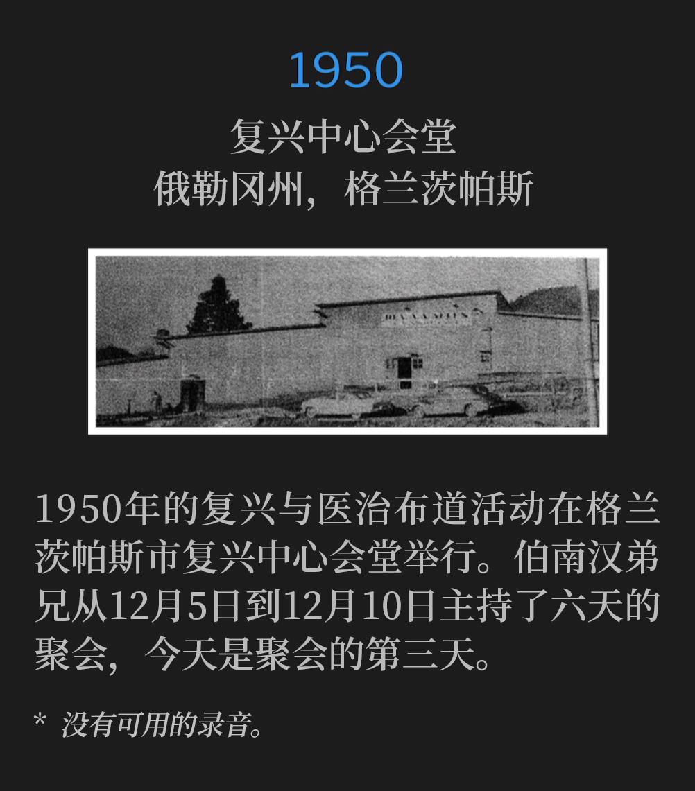1950年12月5日,伯南汉弟兄在俄勒冈州格兰茨帕斯开始了一场复兴和医治布道活动。