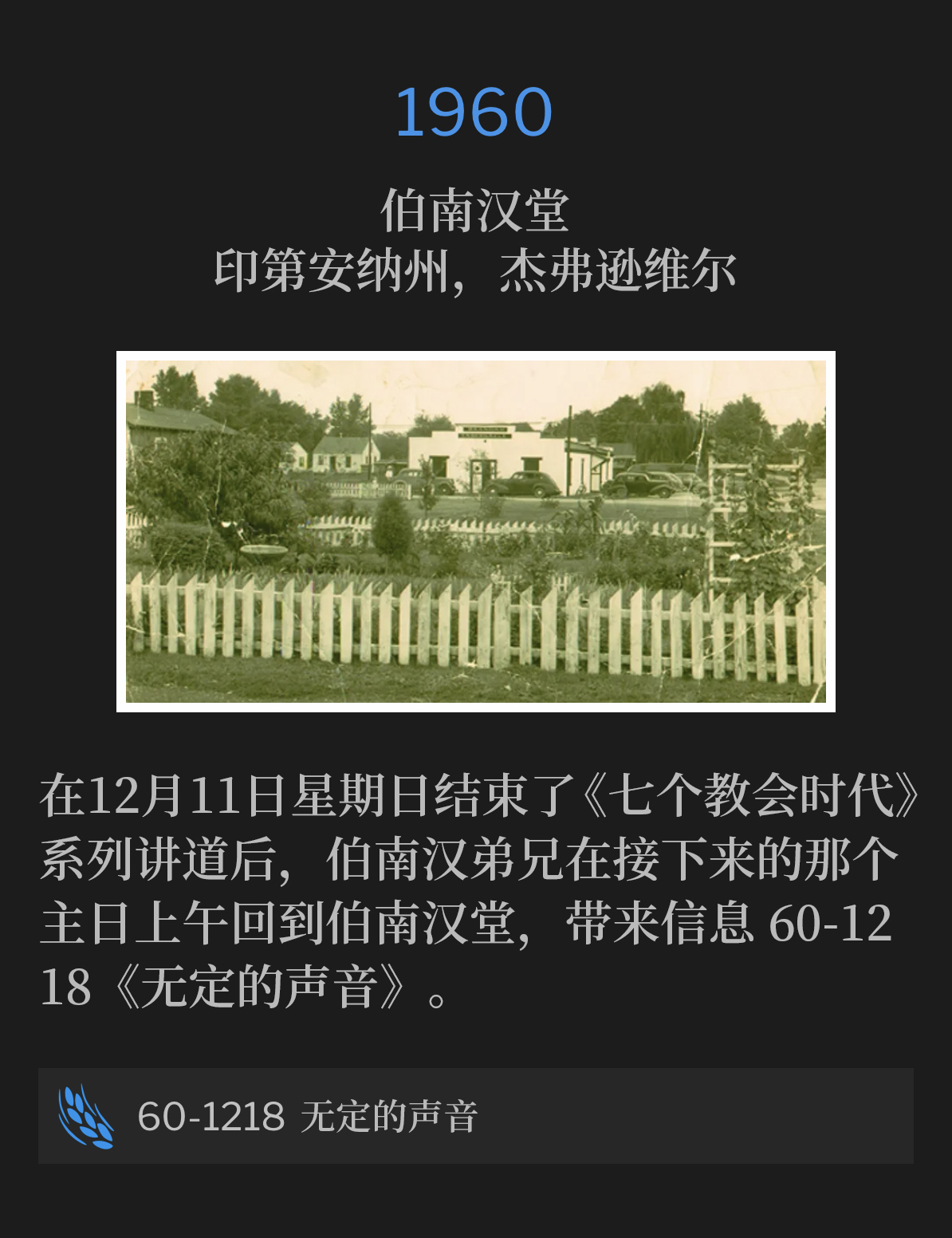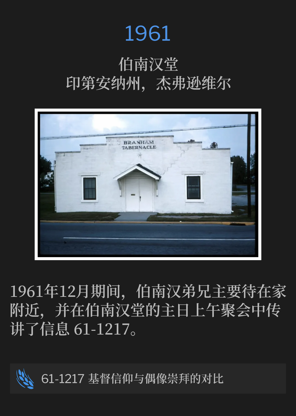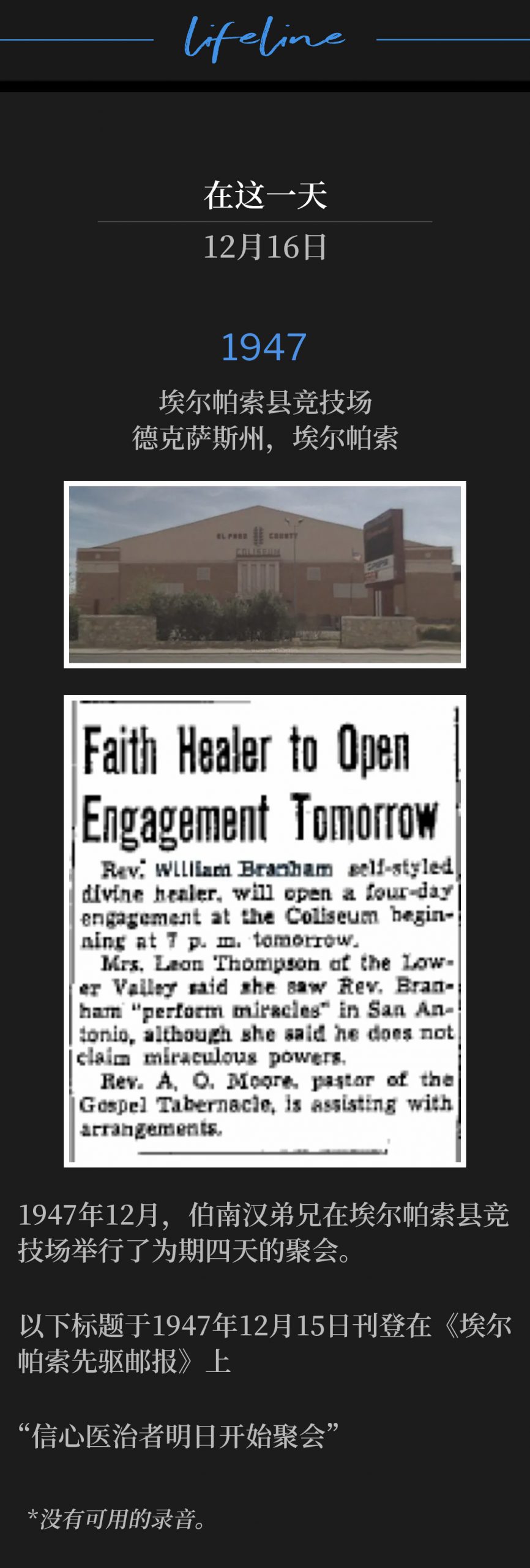 1950年12月5日,伯南汉弟兄在俄勒冈州格兰茨帕斯开始了一场复兴和医治布道活动。