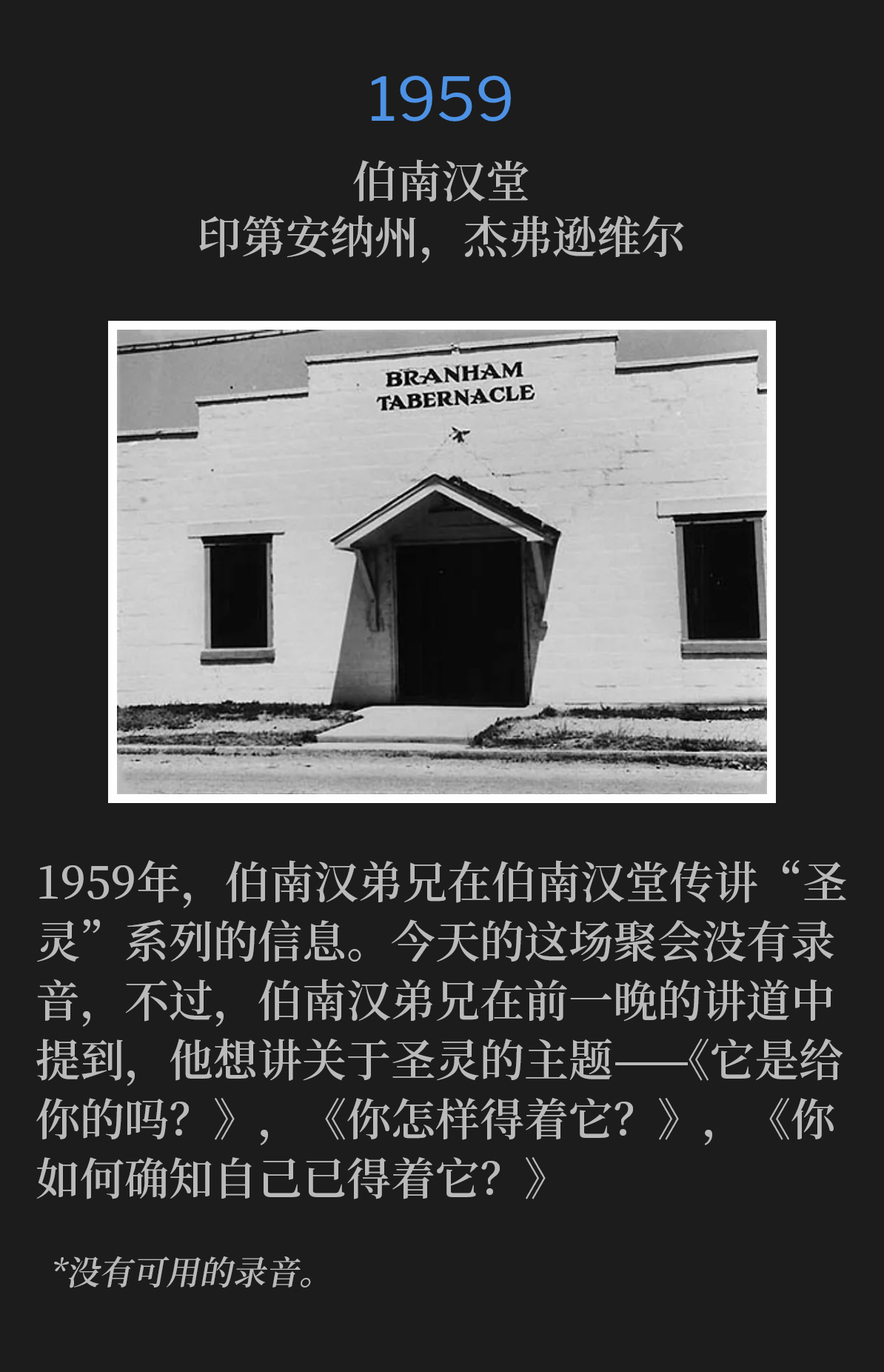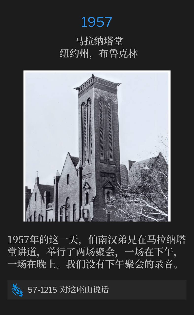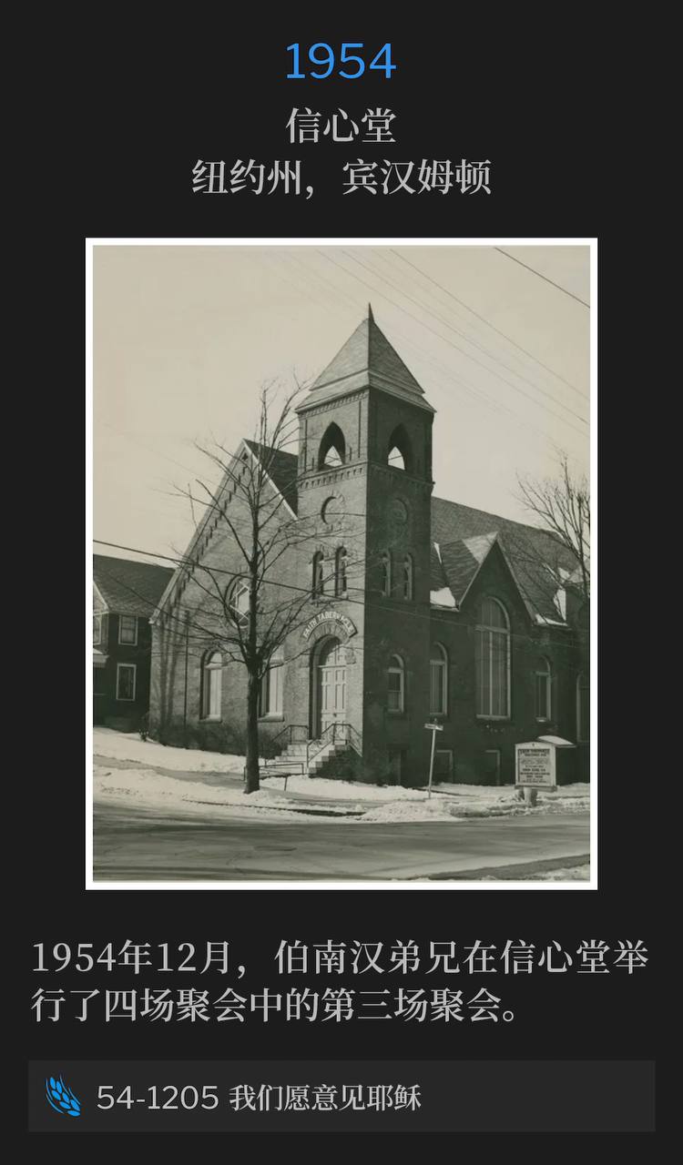 伯南汉弟兄并不自称为伟大的讲道者,但在聚会尾声的主日下午,他讲道了!大能的恩膏临到他身上,神的话语带着大能与赐福从他口中涌出。听众时而屏息凝神,时而呼喊起来。我们因这道的宣讲而大得造就,聚会的最终高潮是众人前来接受救恩,信徒们被圣灵充满。总而言之,我们可以说,这一系列聚会对于本市、周边地区以及所有远道而来的人而言,都是一段极其蒙福的时光。』